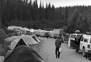 Halb fünf Uhr morgens im Zeltlager am Archie Creek, einem Flüsschen im Norden der kanadischen Provinz British Columbia. Noch ist alles ruhig. So still, dass man den Specht klopfen hört. Daneben das leise Rauschen des Wassers unter der Brücke. Noch schlafen die jungen Leute, die an diesem drückend heissen Sommertag Zehntausende von Bäumen in Kanadas Wildnis pflanzen werden. Ihre bunten Zelte schimmern wie gigantische Blumen im Gebüsch. Zerbeulte Wohnwagen säumen die stillgelegte Forststrasse. Im Schotterdreck das Strandgut des Vorabends: Gummistiefel, Bierflaschen, ein blauer Pullover.