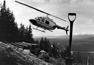 Oben am Berg werden sie auf dem kahlgeschlagenen Gelände ausgesetzt, springen von einer behelfsmässigen Plattform aus Baumstämmen herunter, den Rotorenflügeln ausweichend. Die Rucksäcke werden ihnen nachgeworfen. Vier Frauen und drei Männer sind in der Gruppe des Aufsehers Dan Ouellette. Sie schauen sich das Terrain an und ahnen schon Schlimmes. “Ignoriert die Hemlock-Tannen”, erklärt Dan im Pflanzerjargon, “messt aber Balsam ein, wenn er schön ist wie ein Christbaum. Taucht ein Bär auf, lasst es die anderen wissen.”